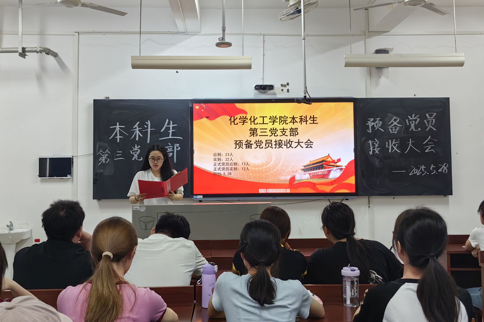 (通讯员 吴晰睿)为严格履行党员发展程序,确保党员质量,5月28日中午,威尼斯432888cam本科生第三党支部于化学楼210教室召开预备党员接收大会。此次大会讨论关于周佳等6名同志接收为预备党员的问题,由本科生第三党支部组织委员蔡紫婧主持。