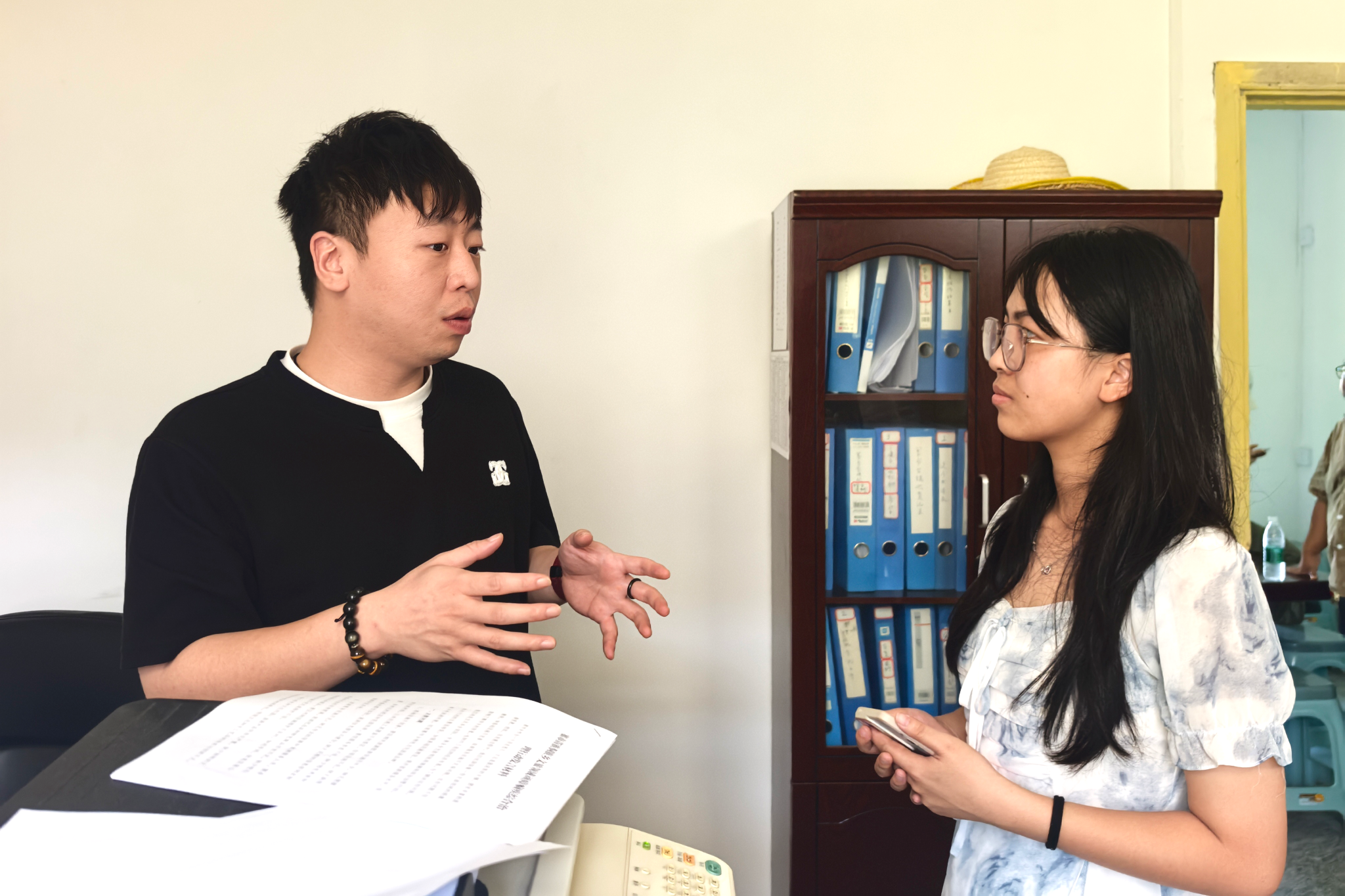 唐旭与实践团成员围绕红色文化传承与发展、红色资源助力乡村振兴等主题深入探讨。实践团成员结合调研方向提问,双方就红色文化教育形式创新、红色资源产业化路径等具体问题交换看法。当地政府人员同步介绍了寨市古镇红色文化资源的整体情况,结合乡域实际阐述了红色旧址保护、红色文化弘扬的具体举措与规划。