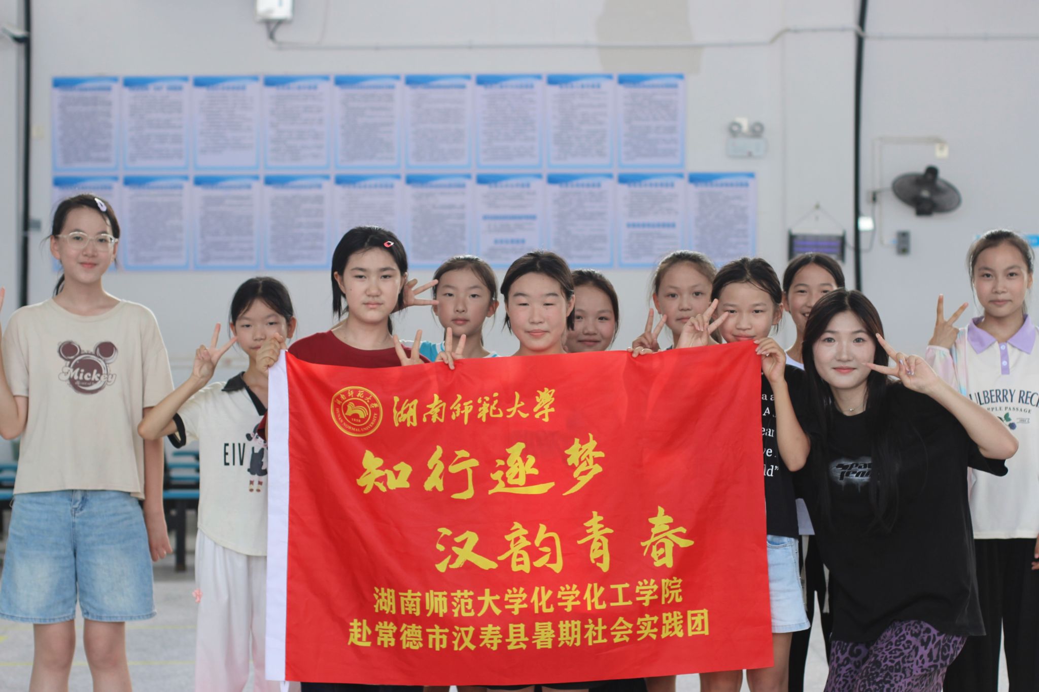舞蹈课后,汉寿县沧港镇中心学校学生与实践团老师同举队旗,定格青春律动瞬间