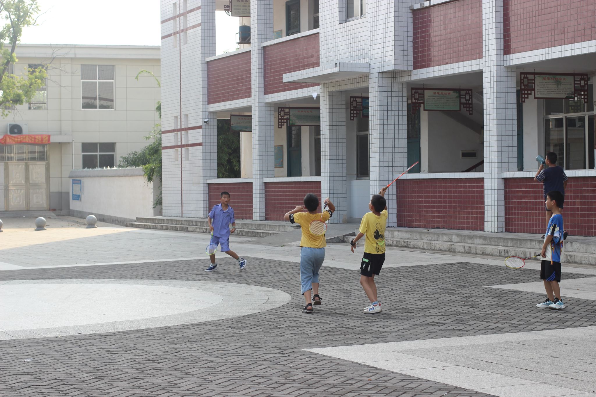 学生们在校园空地交替挥拍,羽毛球在空中来回穿梭