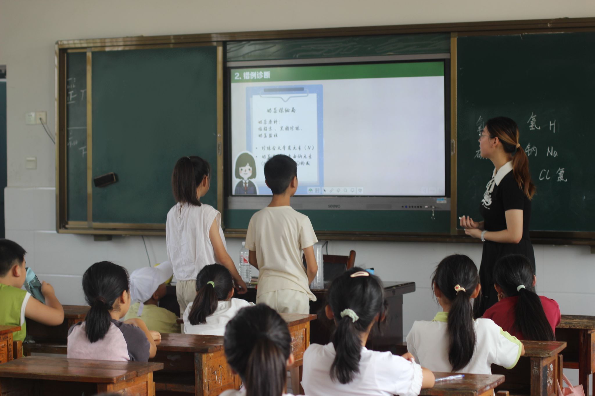 生活中的化学课堂上,两名学生与老师互动,其余同学专注倾听,知识交流氛围浓厚