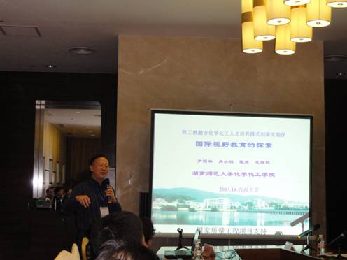 会议期间安排共各类报告68个,专题研讨会2场。尹笃林教授、肖小明教授和毛丽秋教授分别作了分会报告,其教学教改成果受到与会者的关注和好评;尹笃林教授、肖小明教授还主持了27日上午第三分会场的报告,并受邀分别出席了化学类专业本科教学国家质量标准的研讨会和《大学化学》杂志发展研讨会。