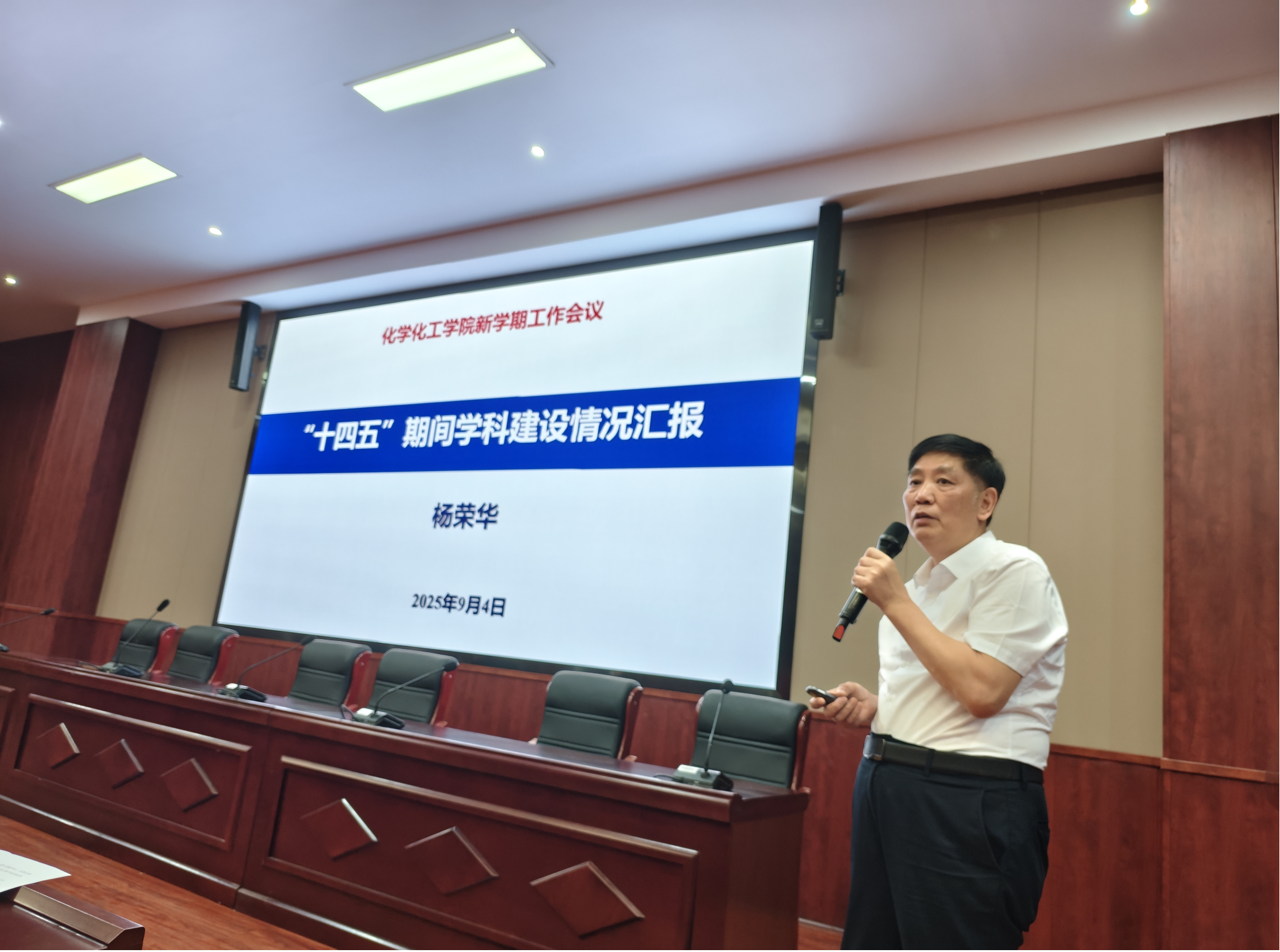 院长杨荣华做“十四五”期间学科建设汇报,他从第五轮化学学科评估回顾、“十四五”期间化学学科建设情况、第六轮与第五轮学科建设情况对比和2025年下学期工作重心等四方面做汇报。