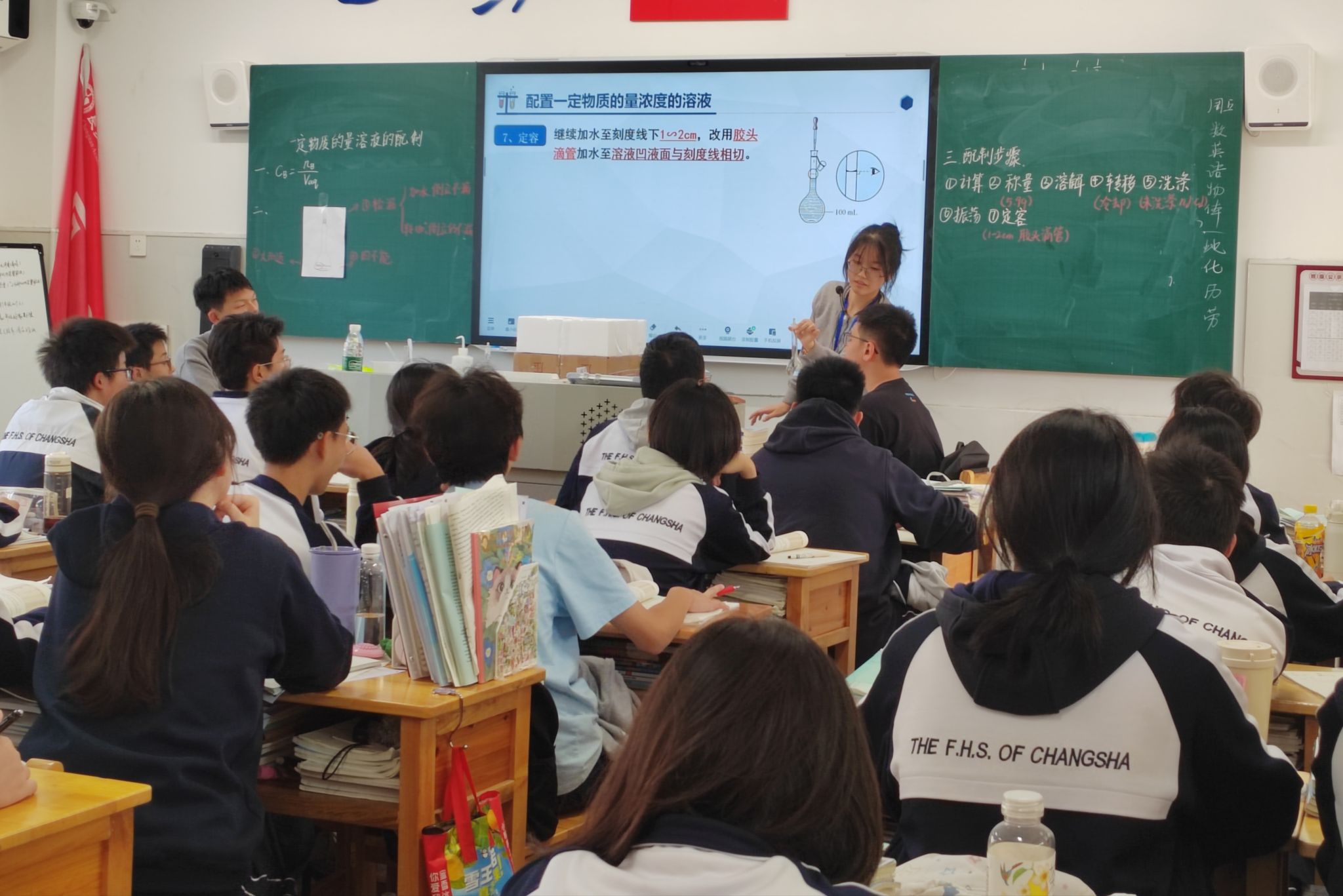 此次汇报课由实习队代表尹美娟主讲《配制一定物质的量浓度的溶液》,她以相关旧知及生活情境为切入点,详细介绍容量瓶构造与使用注意事项,向学生们展示溶液配制全过程。她还注重问题驱动化,用问题带动同学思考,整堂课重难点突出,师生互动积极。