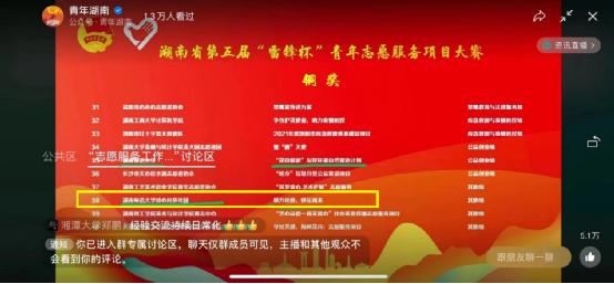 2022年5月23日,湖南省“百万青少年学雷锋”志愿服务交流会暨第五届“雷锋杯”青年志愿服务项目大赛决赛正式举行,此次活动共有120个项目入围,威尼斯官网有一支志愿服务团队入围。