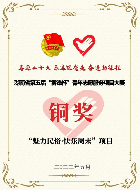 (通讯员 邓星 奚芯蕊)2022年5月26日,威尼斯432888cam青年志愿服务项目喜获佳绩,“魅力民俗·快乐周末”项目在湖南省第五届“雷锋杯”青年志愿服务项目大赛中获得铜奖。