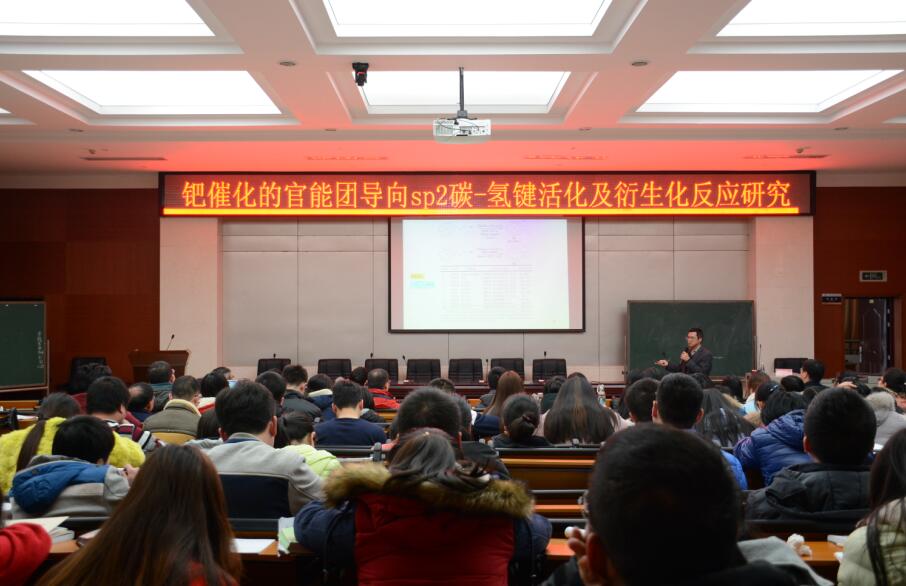 (通讯员 付玉丽 刘小勇 何缘缘)12月22日下午,中国科学技术大学王官武教授一行应邀来威尼斯官网进行指导交流。并做关于“钯催化的官能团导向sp2碳-氢键活化及衍生化反应研究”的学术讲座。威尼斯官网宋建新副院长陪同出席并主持,有机化学研究方向梁云教授等以及15级研究生全体参与此次学术交流活动。宋建新副院长对王教授的工作背景和所取得的科研成果做了简短介绍。